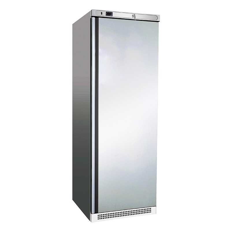 Armoire réfrigérée négative -10/-25°C, de 400 litres, avec 1 porte pleine, une finition extérieure inox et intérieure ABS thermoformé à angles arrondis. Prévues pour température ambiante maximale de 32°C. Volume net de 340 L. Cette armoire réfrigérée négative de 400 L vous permettra de conserver parfaitement vos aliments au quotidien. 7 niveaux fixes au pas de 225 mm.