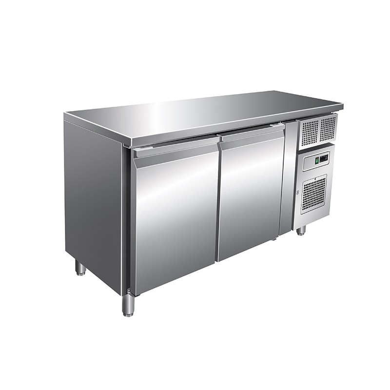 Desserte snack réfrigérée positive -2/+8°C, 2 portes de 260 litres et avec groupe logé froid tropicalisé. Existe avec et sans dosseret. Tout inox AISI 304, sauf l'arrière, angles intérieurs arrondis pour un nettoyage aisé, froid ventilé, portes avec joints magnétiques. Cette desserte réfrigérée positive, peut être utilisée à la fois comme réfrigérateur et comme plan de travail.