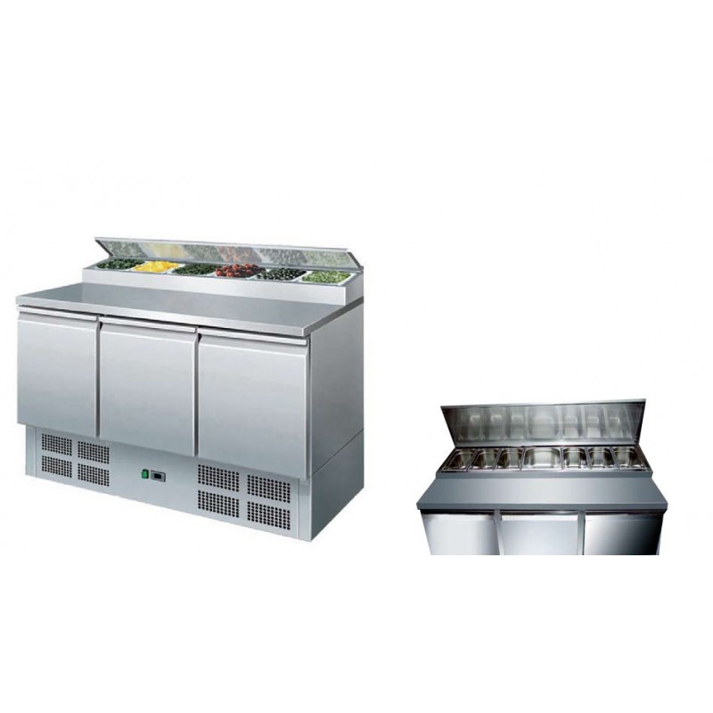 Saladette réfrigérée positive +2/+8 °C, équipée de 3 portes GN 1/1 et d'un volume de 425 L, idéale pour la la préparation des sandwichs, salades, etc... Diffusion du froid par évaporateur statique et enceinte ventilée. Carrosserie extérieure (sauf l'arrière) et intérieure tout en inox AISI 304 avec finition satinée. Plan de travail en inox, surface utile : 1365 x 305 mm.